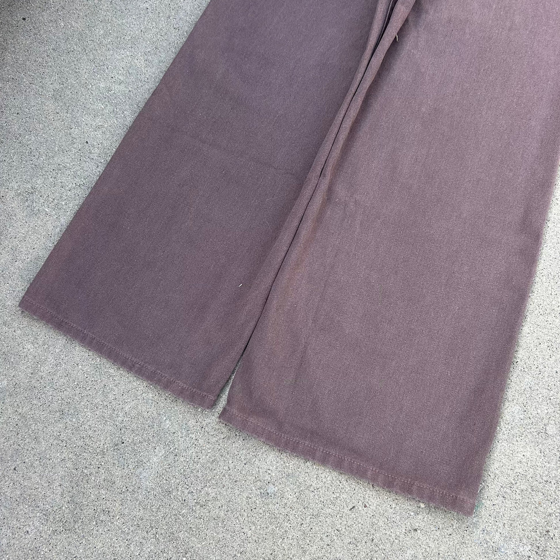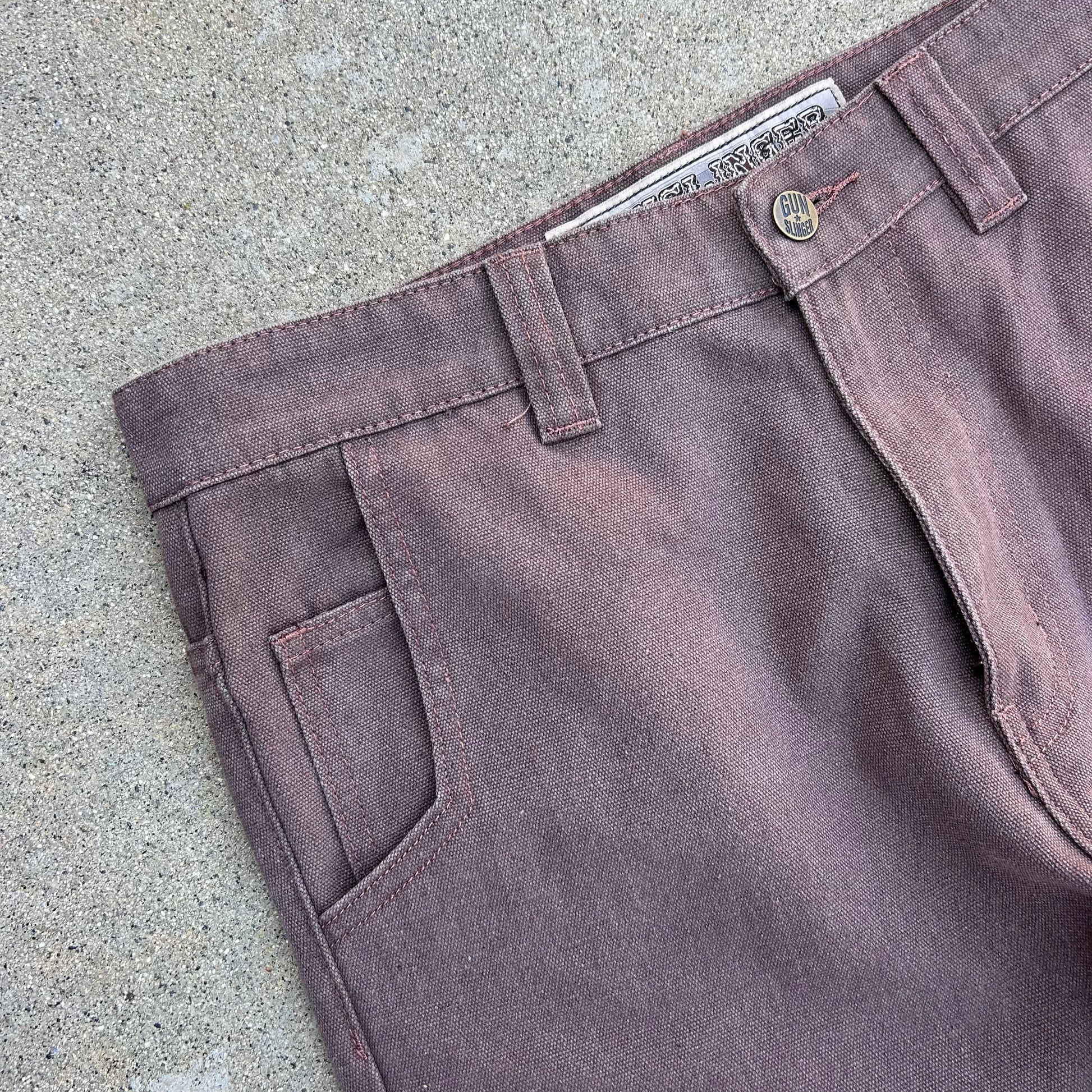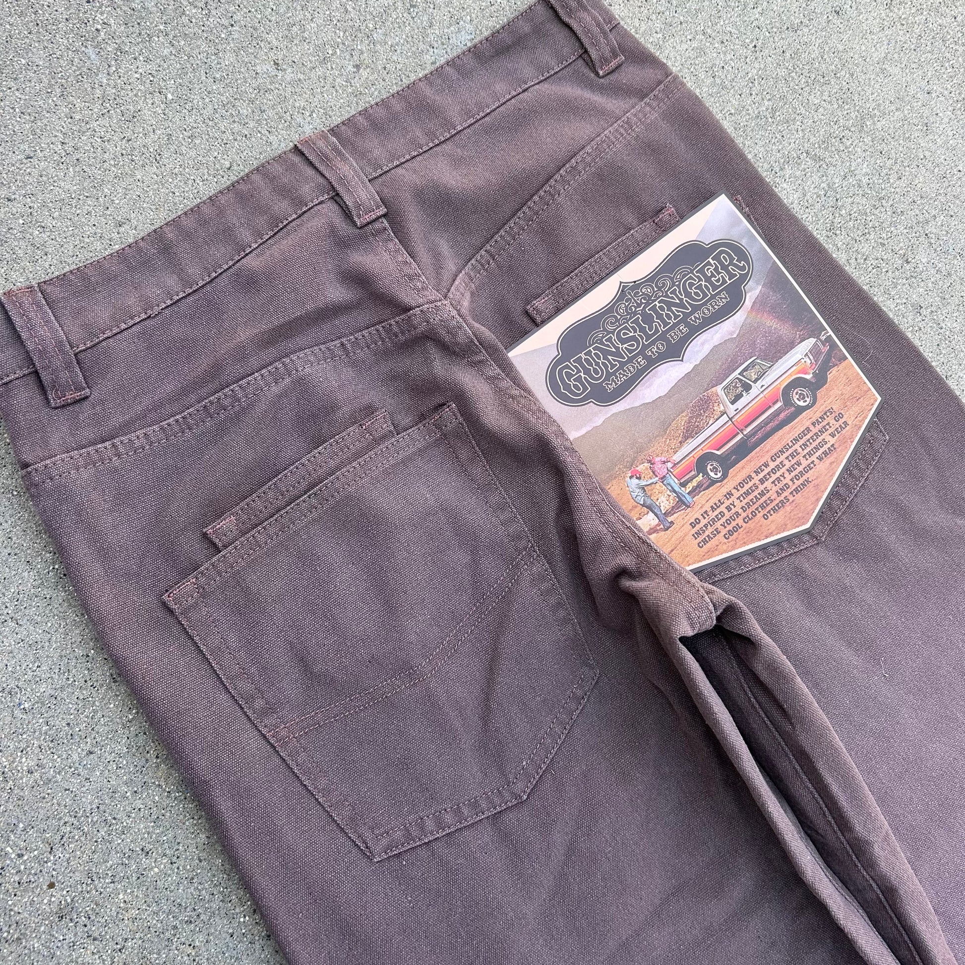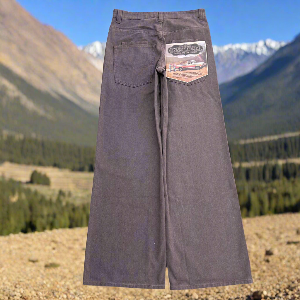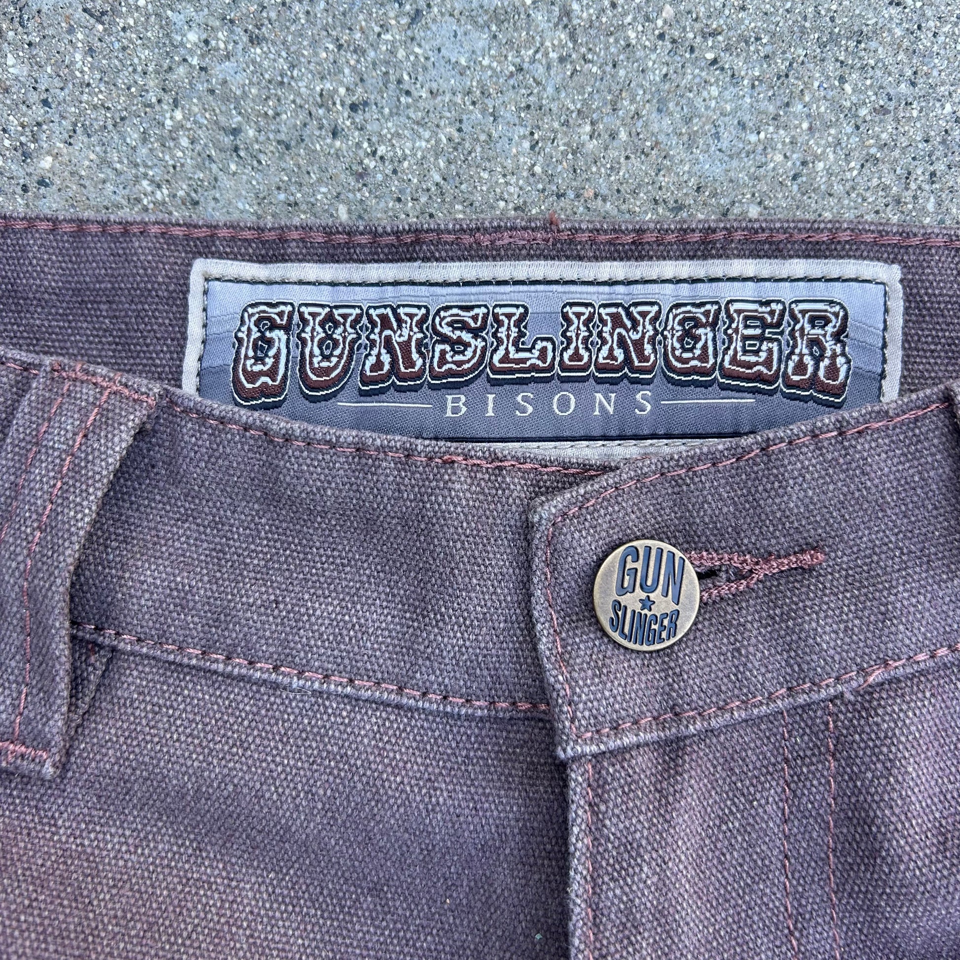 Very informal description as this is my first pant style like this. The Bison name comes from the Animal who lived in north america back in the day. These pants are made for a more a hefty man (like a bison) with some decent legs who wants a nice classy look without running into the issue bellbottoms being made for smaller legs. So depending on how big your legs are they might be more baggy or they might hug your thighs/booty. Obviously they are brown so it works color wise also. The custom back paper tag speaks for itself. Super cool and authentic button. I’d describe the color as a very 70s/80s brown which is what inspired this pant. The material is a mid weight washed canvas which gives it a flowy but durable feel and look. it’s got double pockets which is unique for the time period it hypothetically would come from. i personally love double pockets and sets it apart. double front pockets to match the back! thats the bison!